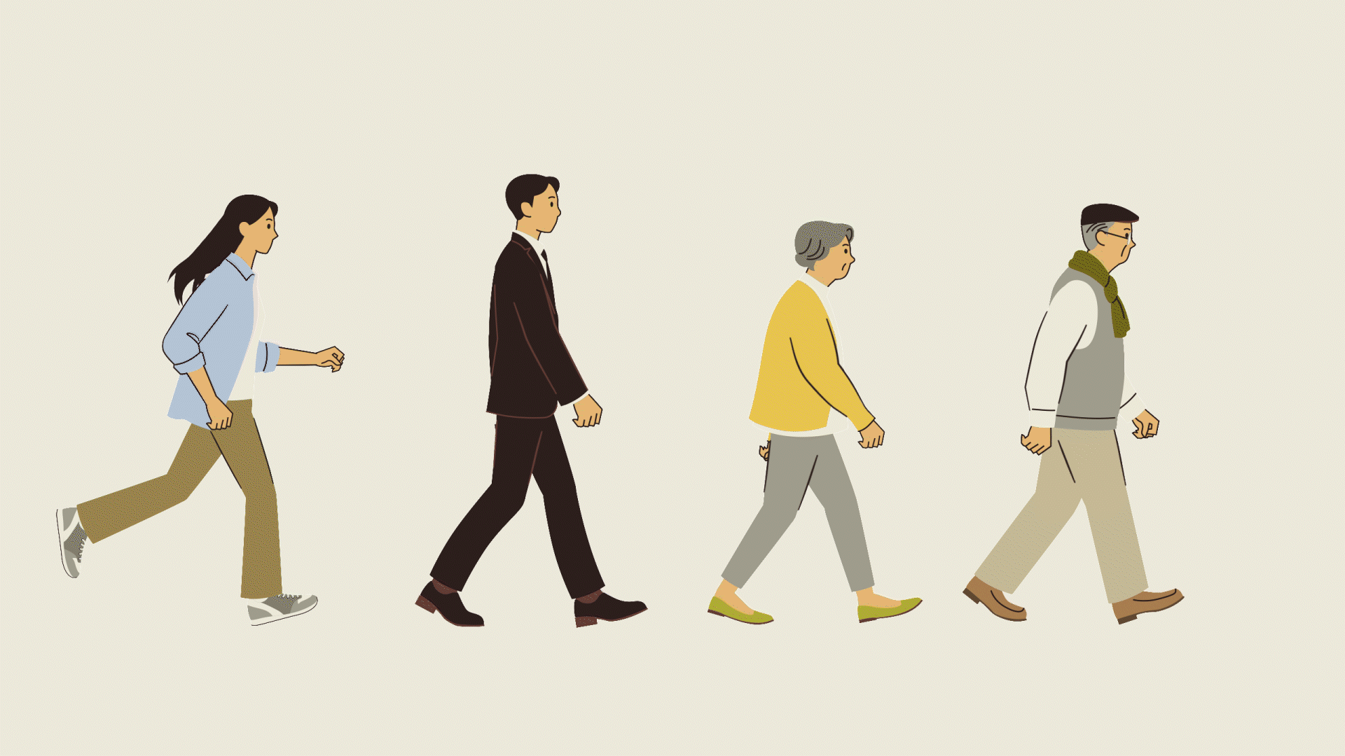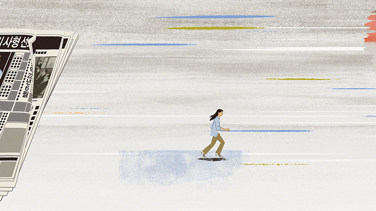 대한민국 국민을 상징하는 다양한 연령대의 캐릭터들이 시대를 넘어 끊임없이 앞으로 나아가는 모습을 통해